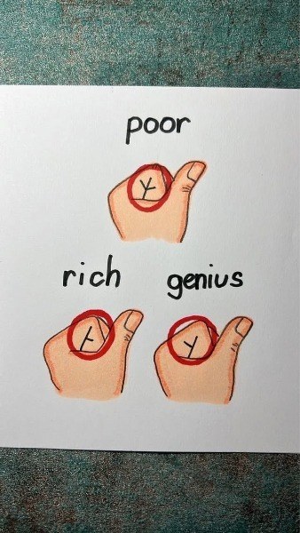 A viral chart circulating online claims that the lines on your thumb could predict your future, including whether you’ll be poor, rich, or a genius. The chart, shared by @condsty, features a thumb with a “Y” shape inside the thumbprint area. The position of the “Y” determines your fate: