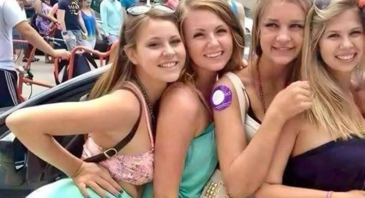 4. Pay attention to the people behind the 4 girls. Do you notice that they all have the same face and the same hairstyle?