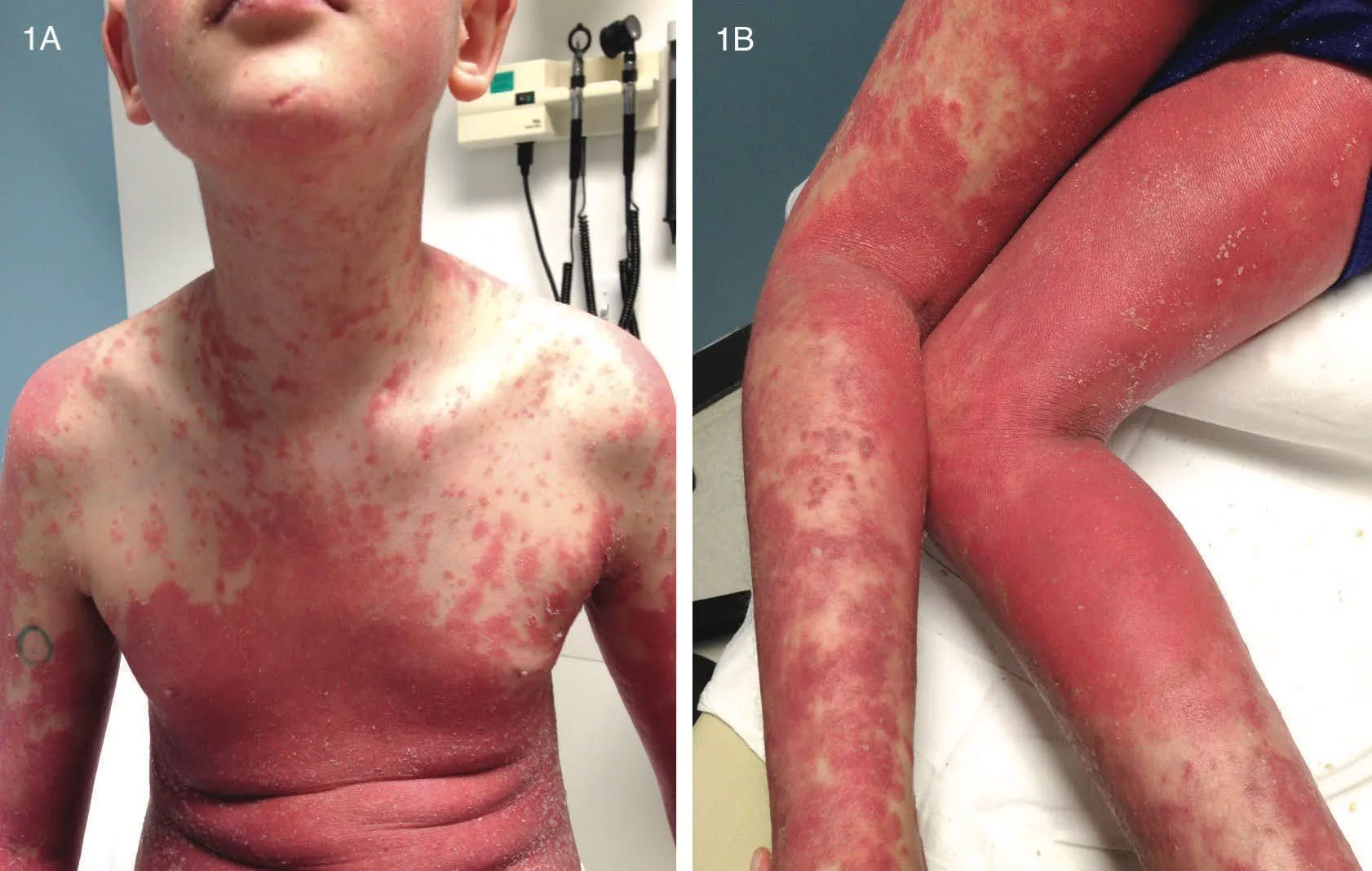 A 10 year-old male presents with a 5 year history of psoriasis that has been increasing in severity over time. His psoriasis has been treated with topical therapies only until recently, when a course of Goeckerman therapy provided temporary improvement but then flared significantly after 1 month. Upon presentation to pediatric dermatology, he has near erythroderma with large bright red scaly plaques and scattered guttate papules and small plaques covering more than 75% of his body surface area (Figures 1A and 1B). There are scattered superficial erosions within the larger plaques. He has missed the last 4 weeks of school due to malaise, intermittent chills, and severity of his psoriasis, which is painful and has reduced his ability to walk and sit comfortably. During the visit, he does not make eye contact and answers questions with shoulder shrugs and one-word answers. He is otherwise healthy, has no known recent infections and takes no medications. A review of systems is positive for malaise, fatigue, skin tenderness, reduced range of motion of the extremities due to erosions at flexural sites, depressed mood and social withdrawal. He has not had pain, swelling or stiffness of his joints and denies ocular symptoms. His family history is positive for psoriasis and vitiligo. He is accompanied by his parents, who are separated. His mother is in tears, and his father is very frustrated throughout the visit. The patient has been having rage attacks at home and has withdrawn from his friends and social activities. How should we approach this child in terms of psoriasis comorbidities?