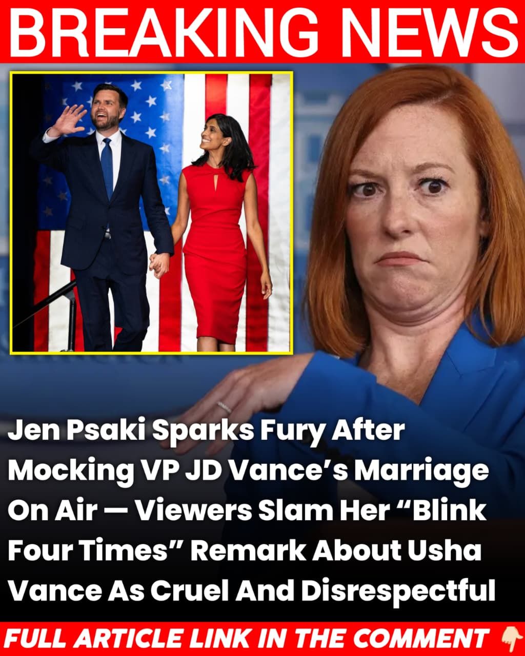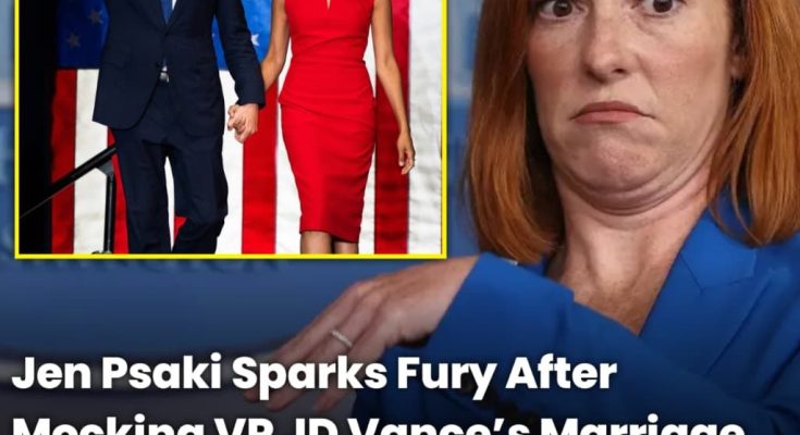 Former White House Press Secretary Jen Psaki is facing major backlash after a controversial segment on her MSNBC show, where she appeared to mock Vice President JD Vance’s marriage and made a remark implying his wife, Usha Vance, might need to “blink four times” if she wanted to be “saved.” The comment, which came during a discussion on Vance’s political rise, quickly ignited outrage across social media, with conservatives condemning Psaki for crossing a deeply personal and inappropriate line.