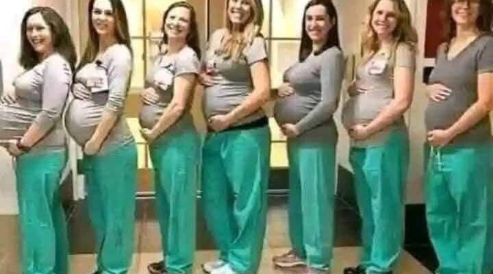 At first glance, all seven women in the picture seem to be expecting. They are all standing in similar postures, with hands resting on their bellies, giving the impression of pregnancy. However, upon closer inspection, subtle clues reveal that one of them is just pretending.